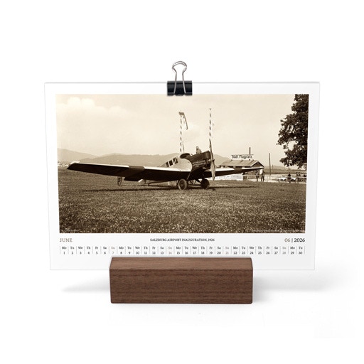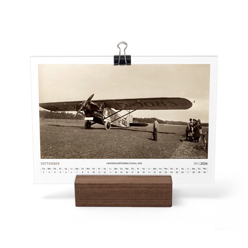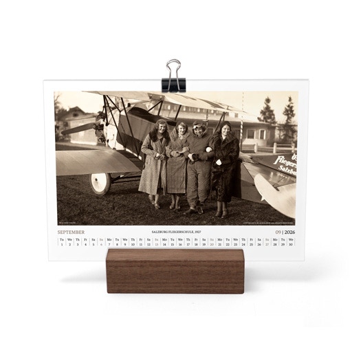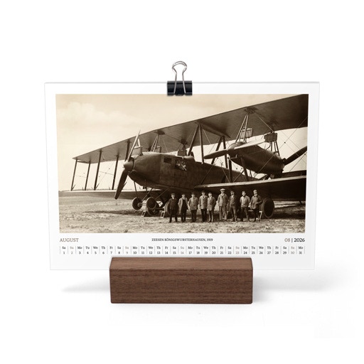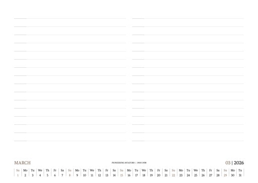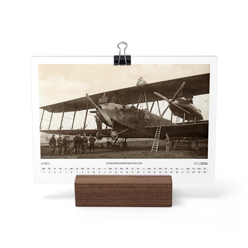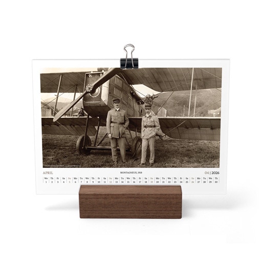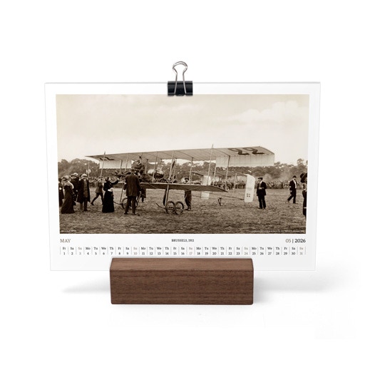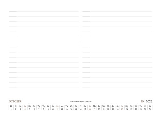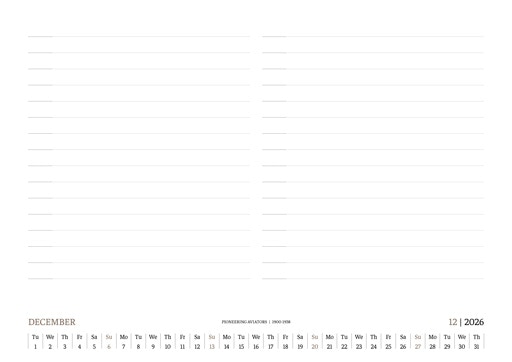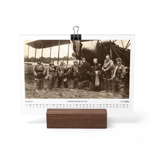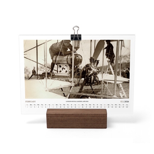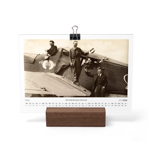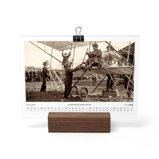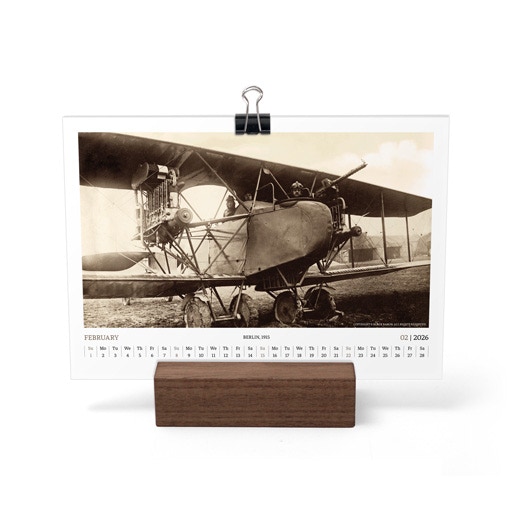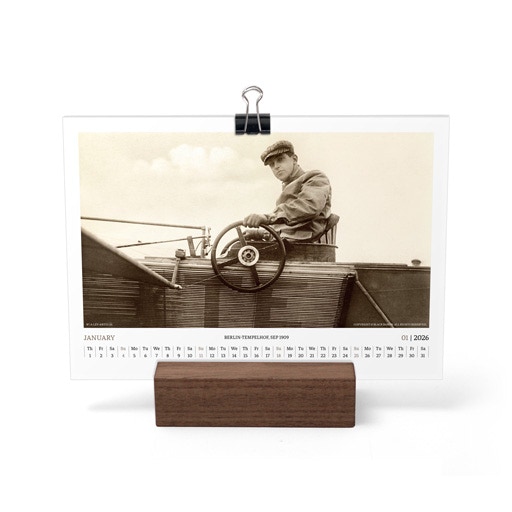 TIME FLIES BEAUTIFULLY. A DESK CALENDAR TO KEEP YOUR FLIGHT TIMES AND PERSONAL NOTES READY FOR TAKEOFF. AVIATION HISTORY RANGING FROM 1900 TO 1938.