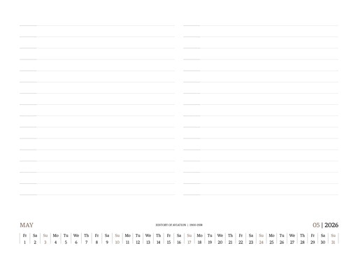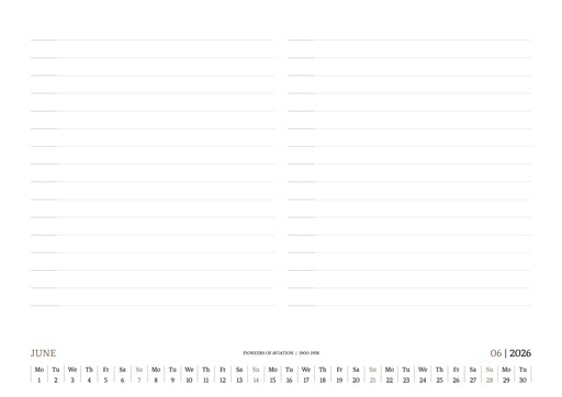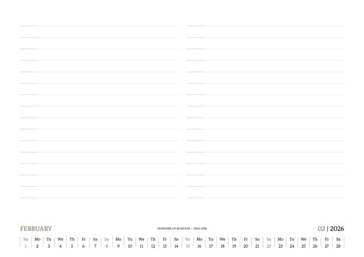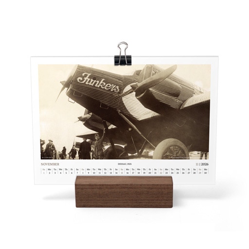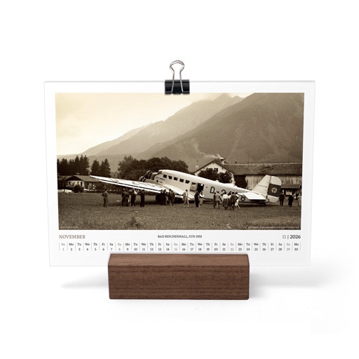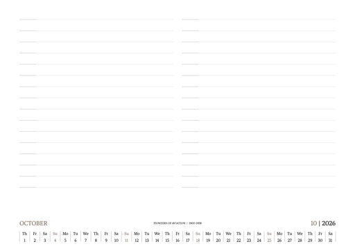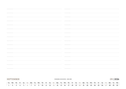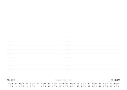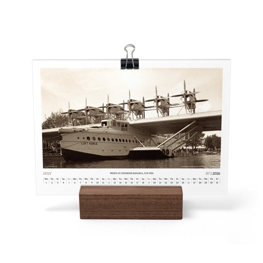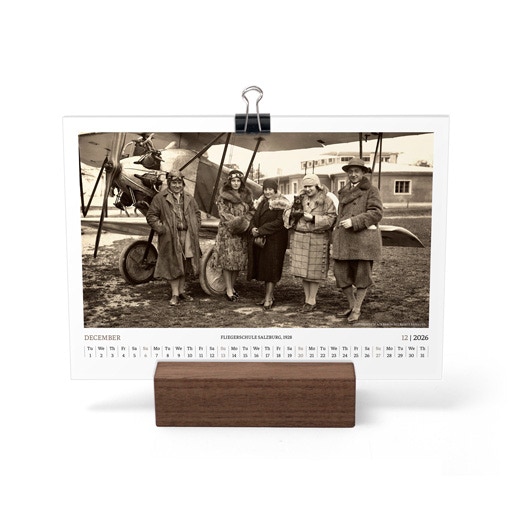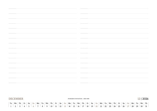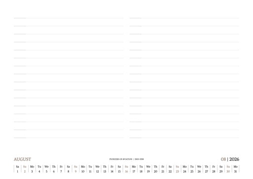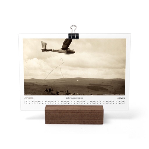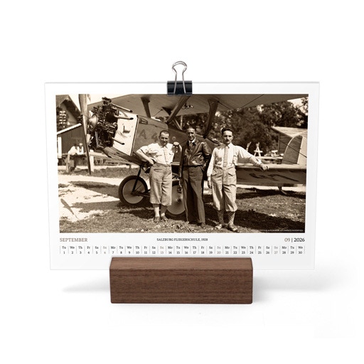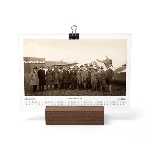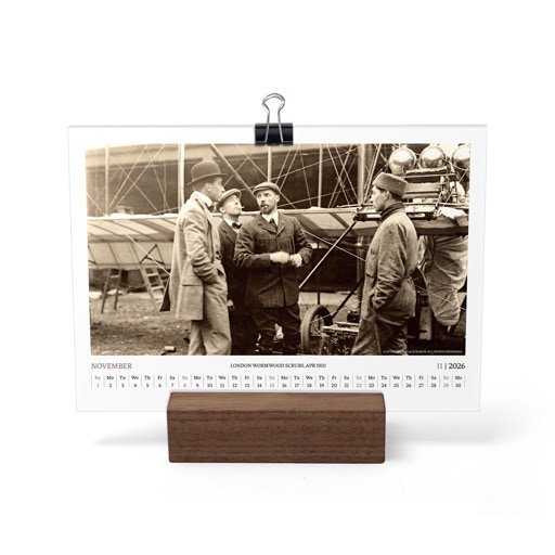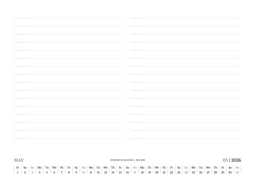 TIME FLIES BEAUTIFULLY. A DESK CALENDAR TO KEEP YOUR FLIGHT TIMES AND PERSONAL NOTES READY FOR TAKEOFF. AVIATION HISTORY RANGING FROM 1900 TO 1938.